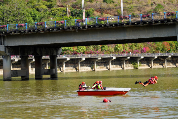 当天的演练假设2022年4月26日米易县突发暴雨,持续时间超过20小时,局部地区6小时降雨量高达300毫米,造成米易县3个地区受灾,受灾境线超过50公里,100余人被困,境内主要流域沿线受灾严重。辖区消防救援队伍首先响应,并向支队领导报告洪涝灾情,同时请求调派力量增援。消防救援支队迅速启动调度增援预案,全勤指挥部遂行出动,支队抗洪抢险突击队立即赶赴现场进行处置,全力开展救援。结合近年来抗洪抢险典型案例和消防救援队伍日常训练实际,现场各参演单位按照灾情设定开展了舟艇驾驶技能展示、舟艇离心力救援、舟艇翻舟自救、潜水救援、入水救援、绳索救援6个科目的展示,最大程度地贴近实战、还原真实救援现场。
