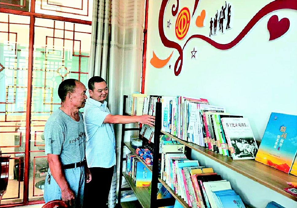 全国劳动模范杨华顺(左)在景区工会驿站书屋了解藏书情况